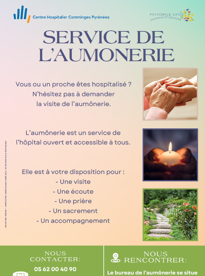 Dans le respect de la loi de 1905, le service de l’Aumônerie de l’Hôpital a pour objet premier d’honorer les besoins spirituels et religieux des personnes qui le demande quelle que soit leur religion. L’aumônerie est disponible dans chaque service de l’Hôpital pour offrir à toute personne, l’écoute, et le soutien dont elle a besoin dans le respect de ses convictions et de ses valeurs.